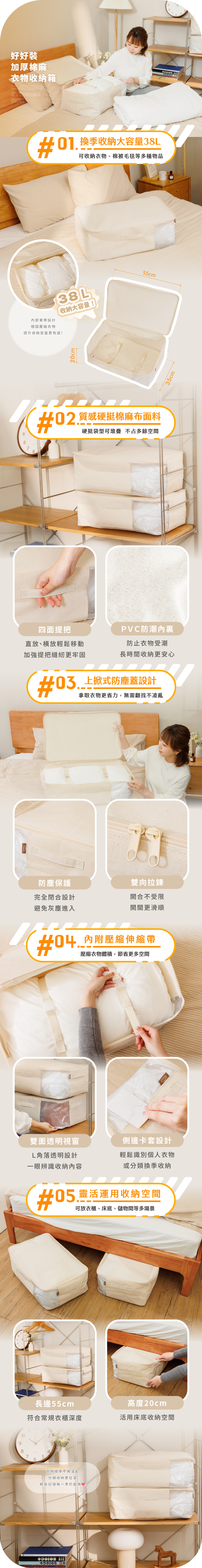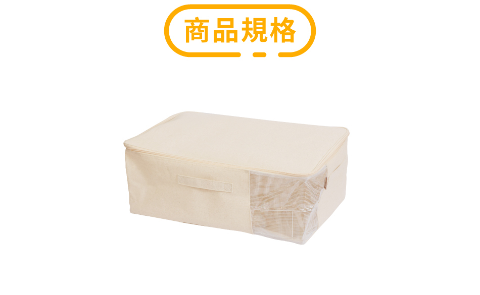 ・本產品僅供衣物收納使用,請勿將本產品使用於非本產品所列之用途。 ・本產品禁止水洗、乾洗等,若有髒污建議可以乾布擦拭。 ・本產品耐重約10公斤,且無壓縮衣物之功能,請勿放入過多或過重的衣物,以免導致拉鍊無法正常開合或造成損壞。 ・使用本產品時,請注意週遭尖銳物品,以免劃傷、損壞本產品。 ・使用本產品時建議雙手拿取,並請注意安全。 ・請注意,本產品接觸水或帶有水氣的物品,可能會導致染色、污染、磨損。 ・請勿將本產品放置於潮濕、陽光直射的環境,並請遠離火源。 ・成分中含有棉、麻等天然纖維,表面上若有棉殼等顆粒屬於正常情況,非產品瑕疵。 ・尺寸為手工測量會有些許誤差,請依實際商品為準。 ・因各廠牌螢幕解析度、畫質設定不同,商品顏色以實際收到為主。 |