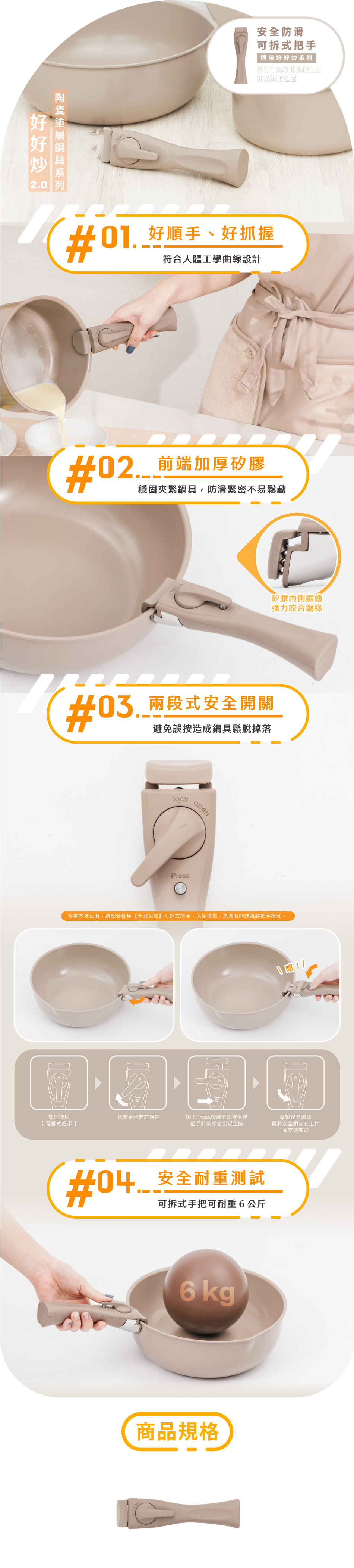 ・ 本產品為食品接觸用途,僅適用於【卡宜家居】好好炒陶瓷鍋系列,並僅供移動鍋具使用,烹煮時請拆卸本產品,請勿將本產品使用於其他產品及用途。 ・ 本產品與鍋具之安裝與分離,請於平面處進行,並請務必按本產品使用說明確認安全鎖完成鎖定後,再開始移動鍋具。 ・ 移動鍋具時,切勿碰觸本產品上的安全鎖或按鍵,並請勿使用本產品拿取超過6公斤之物品,以免發生危險。請避免使本產品接觸火源,並請勿將本產品放入烤箱,以免產品損壞,影響使用安全。 ・ 如使用過程中發現本產品故障或損壞,請勿繼續使用,以免發生危險。 ・ 本產品含金屬製品,請勿放入有微波或光波的爐具,如微波爐、水波爐等。 ・ 請勿將本產品放入洗碗機或烘碗機,以免變形,並請勿用水清洗本產品,以免生鏽。 ・ 本產品可重複使用,本產品每次使用完畢後,以濕布清潔保養即可。 | |
