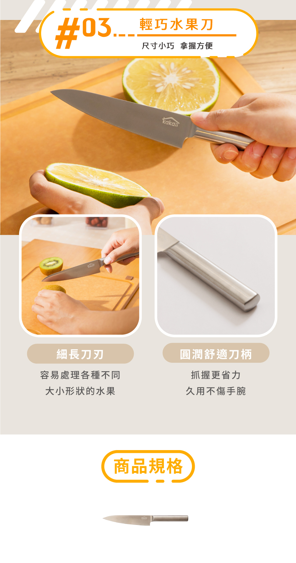 | 品 名 | 好好切輕巧水果刀 | 材 質 | ・水果刀(小):刀面-德國鋼材1.4116(X50CrMoV15);刀柄:430不銹鋼(CNS430) | 尺 寸/重 量 | ・水果刀(小):23 × 2.9 × 1.2 cm / 89g ±10% | 產 地 | 台灣設計・監製|中國製造 |