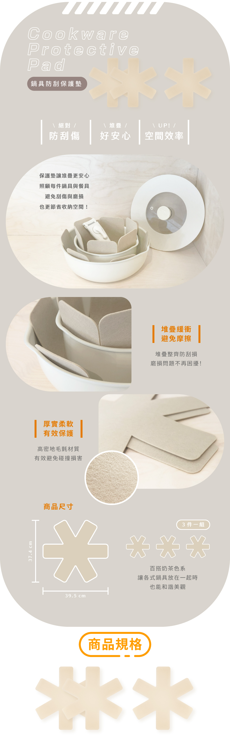 | 品 名 | 鍋具防刮保護墊 | 材 質 | 聚酯纖維 | 尺 寸 | 39.5 x 37.4 cm | 總 重 量 | 85g | 產 地 | 台灣設計・監製|中國製造 |