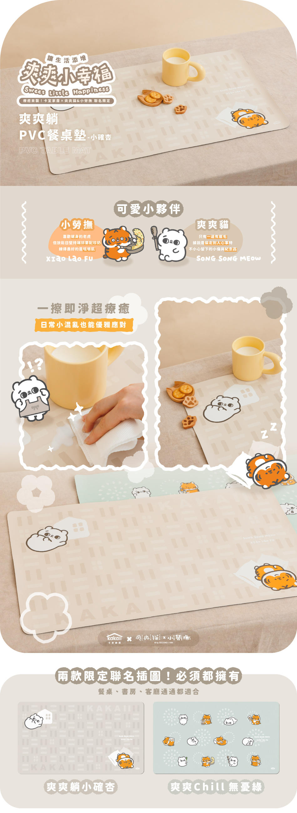 | 品 名 | 【爽爽貓x小勞撫聯名款】爽爽躺PVC餐桌墊-小確杏 | 用 途 | 防止桌面髒汙、刮傷 | 數 量 | 1 入 | 材 質 | 聚氯乙烯(PVC) | 尺 寸 | 40 × 70 × 0.18 cm±5% | 總 重 量 | 310 g±10% | 產 地 | 台灣設計・監製|中國製造 |