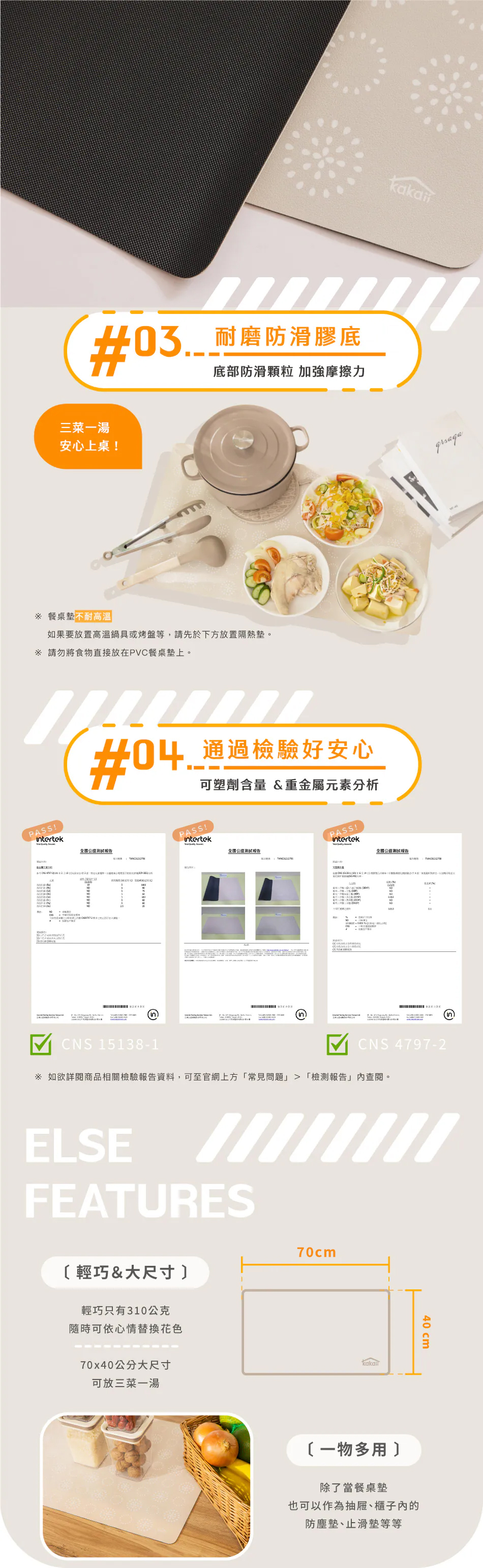 ・請勿將本產品使用於非本產品所列之用途。 ・本產品初次開封時會有PVC製品特有氣味,建議可用濕布清潔後置於通風處陰乾,待氣味減少後再使用。 ・本產品請勿直接接觸食品,並請勿將高溫鍋具、烤盤等直接置放本產品上,以避免造成危險或本產品損壞。 ・本產品表面若使用後有污漬可以濕布或溫水清潔,如需搭配清潔劑建議使用中性清潔劑, 請勿使用酒精擦拭,以避免本產品發生褪色或材質損壞之可能。 ・若為咖啡、醬油等顏色較深的污漬,請依照前述清潔方式立即清理,以避免造成本產品染色留下痕跡。 ・請注意,若長時間鋪設於桌面的情況下,將可能導致桌面會有染色的情況發生。 ・請勿使用刀具或銳利工具在本產品上進行切割或刮削,以避免造成本產品損壞或影響原使用用途。 ・請勿將本產品放置於高溫處、火源旁或高溫曝曬的空間,以避免造成本產品損壞之風險。 ・本產品為重覆性使用產品,但如您發現本產品已有材質刮傷、龜裂等現象, 表示其品質已劣化或老化且易藏污納垢,建議立即停止使用並更換新品。 ・ 如沾染較易染色的物質,須馬上清理,避免色素殘留。 ・ 產品本身會有些許氣味,可使用溫水擦拭後,通風放置一段時間,異味即可消散。 ・ 尺寸為手工測量會有些許誤差,請依實際商品為準。 ・ 因各廠牌螢幕解析度、畫質設定不同,商品顏色以實際收到為主。 |
