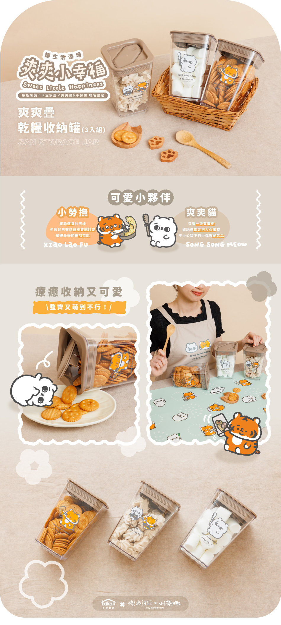 | 品 名 | 【爽爽貓x小勞撫聯名款】爽爽疊乾糧收納罐3入組 | 材 質 | 瓶身-SAN(苯乙烯)、上蓋-ABS(丙烯腈-丁二烯-苯乙烯) 上蓋密封條-矽膠。 | 尺 寸/重 量/容 量 | 10.3 × 10.3 × 15.7cm ±5%(含上蓋及產品瓶身)