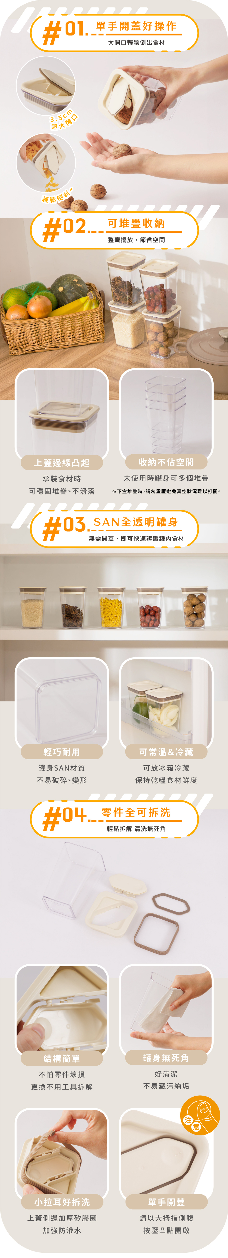| 耐熱溫度 | 瓶身-SAN(苯乙烯):-20~80℃ 上蓋-ABS(丙烯腈-丁二烯-苯乙烯):-20~80℃ 上蓋密封條-矽膠:-20~190℃ | 產 地 | 台灣設計・台灣製造 | 注意事項 | ・本產品為食品接觸用途,但請勿將本產品使用於非本產品所列之用途。 ・本產品僅適用於收納乾性食材,請勿盛裝高油脂、高溫、強酸、強鹼的化工材料或碳酸等物品或飲品,亦請勿長時間接觸含酒精物質,可能發生材質膨潤或產生異味,造成本產品材質損壞影響正常效用或造成危險。 ・本產品供重複性使用,請於初次使用前及每次使用後以軟海綿與中性清潔劑清洗,並於通風處陰乾,請勿將本產品放入烘碗機、消毒鍋內進行清洗,以免本產品發生變形、壞損等情事,影響正常效用。 ・請勿使用粗硬材質之清潔刷清洗,避免本產品產生刮痕或壞損。 ・拿取時請抓取本產品之瓶身本體,避免本產品掉落地面或遭強力碰撞,或將本產品以投擲、扔摔等行為,將導致本產品破裂壞損,且易造成危險。 ・取物後,請確認本產品蓋緊上蓋並直立擺放,並放置於穩固之平面位置及兒童或寵物無法取得之處,以避免本產品傾倒或掉落造成危險。 ・下盒堆疊時,請勿再向下重壓,避免商品因真空而導致無法拉開或是裂損的狀況發生,導致商品無法正常使用。 ・本產品可儲放於常溫與冷藏環境(建議4℃~30℃),勿放置於高溫處、火源旁或曝曬的空間,避免本產品變形壞損。 ・本產品僅適用於儲放乾性食品儲物使用,不可放置於爐灶、烤箱、電鍋、微波爐等高溫或是有化學物質之環境中使用。 ・本產品於您正常使用之情況下,將可能出現表面輕微刮痕或磨損,屬自然耗損,若您發現本產品有材質刮傷、龜裂、破損、缺口或變形等情況時,請立即停止使用,以避免造成危險,保障您的安全。 ・如於洗碗機使用本產品會導致使用壽命減短,若本產品已有刮痕或霧化,不建議再做使用,請更換新品。 ・尺寸為手工測量會有些許誤差,請依實際商品為準。 ・因各廠牌螢幕解析度、畫質設定不同,商品顏色以實際收到為主。 |