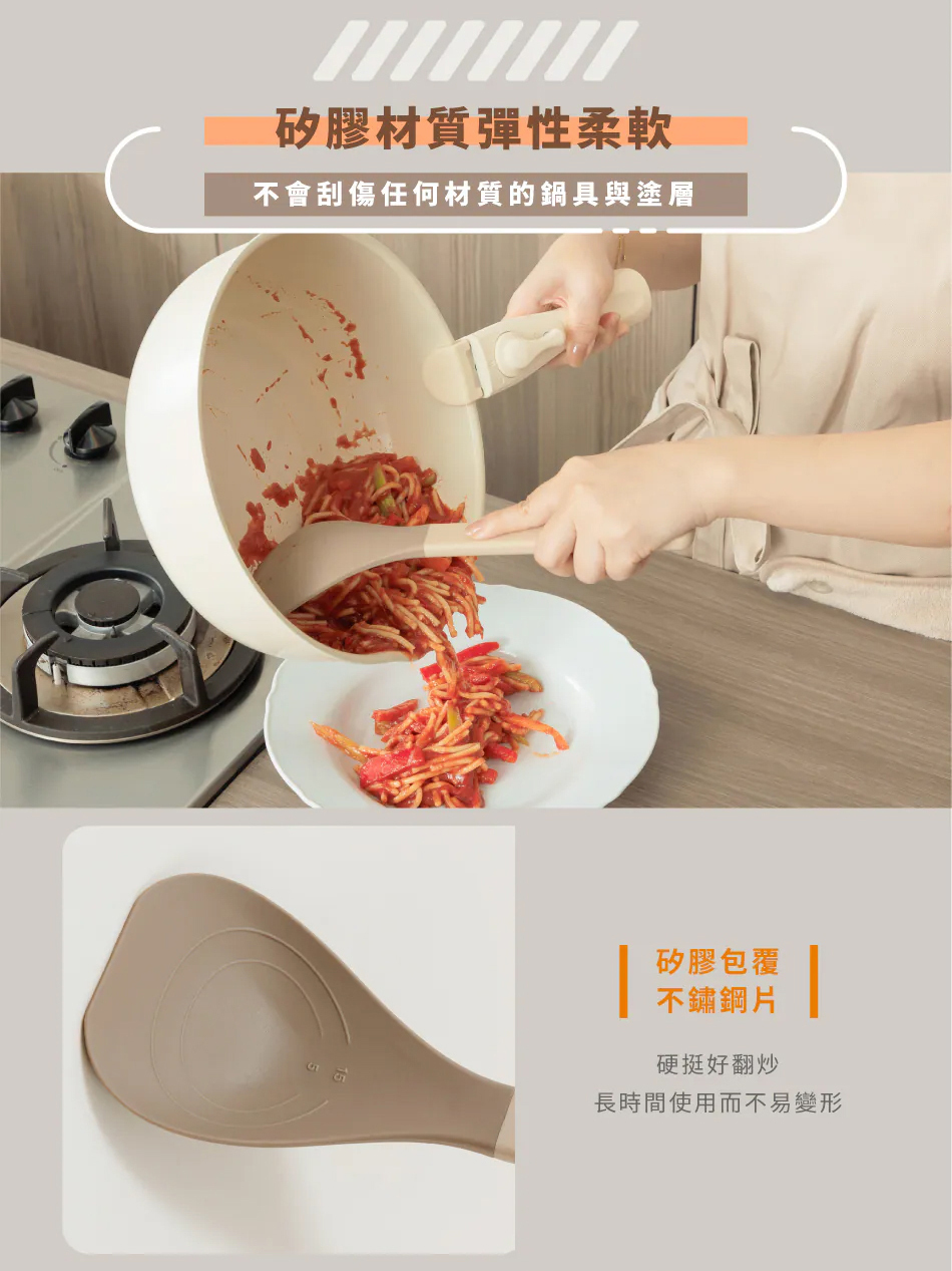 ▸ 前端矽膠包覆不鏽鋼片,硬挺更好翻炒、久用不怕變形。