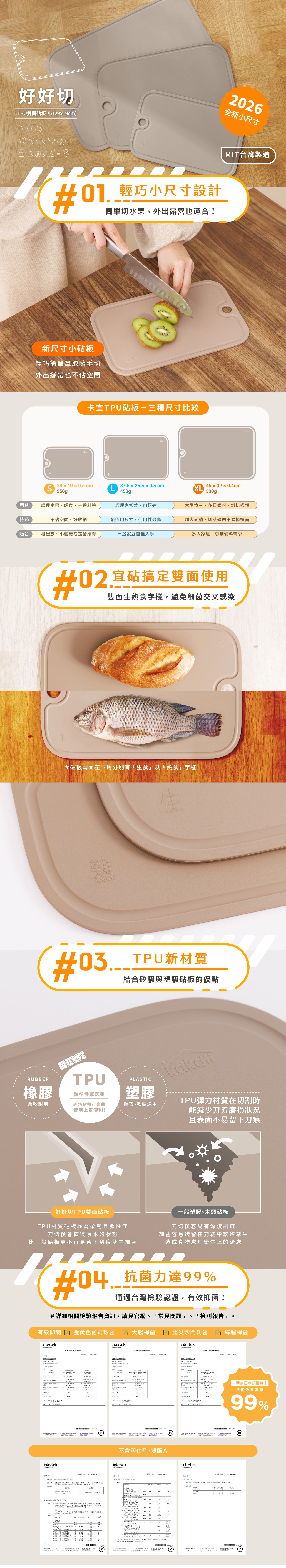 | 品 名 | 好好切TPU雙面砧板-小 | 材 質 | 熱塑性聚氨酯(TPU) | 尺 寸/重 量 | 29 × 19 × 0.5 cm ±5%/350g ±5% | 產 地 | 台灣設計・台灣製造 |