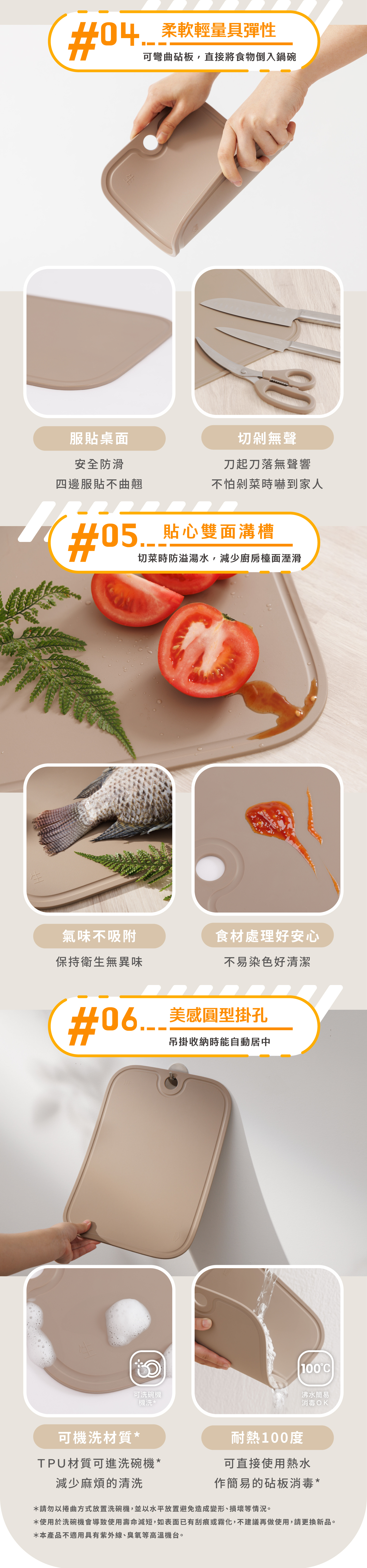 ・本產品在正常使用之情況下,可能出現表面輕微刮痕或磨損,屬自然耗損,若您發現砧板有刮傷破損、龜裂或變形時,請立即停止使用避免造成危險。