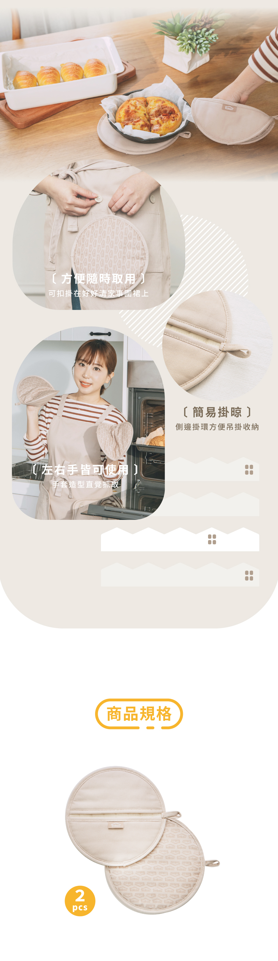|注意事項| ・商品為隔熱使用,請勿使用於其它用途。 ・使用時可以將手放入開口以印花面拿取用品。 ・當鍋墊使用時,可以將印花面朝下放置。 ・請勿將商品直接碰觸熱源或明火。 ・非耐熱、耐火專業器材,本商品適用於料理器具、食器、鍋具拿取。 ・手套濡濕時請勿使用,避免隔熱效果降低造成燙傷。 ・建議手洗清潔,請勿烘乾、漂白、熨燙。 ・尺寸為手工測量會有些許誤差,請依實際商品為準。 ・因各廠牌螢幕解析度、畫質設定不同,商品顏色以實際收到為主。 |