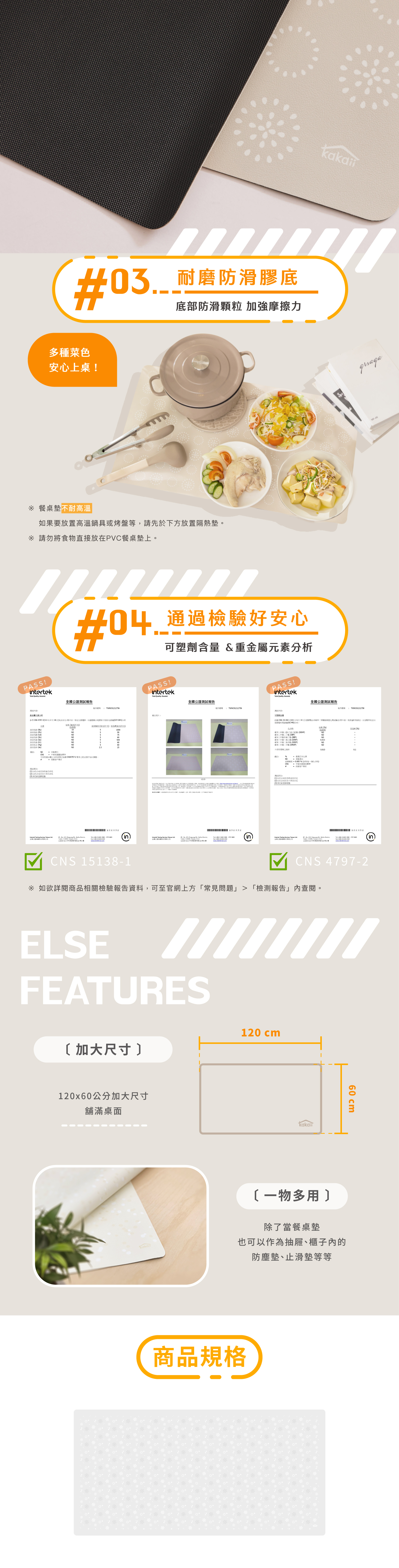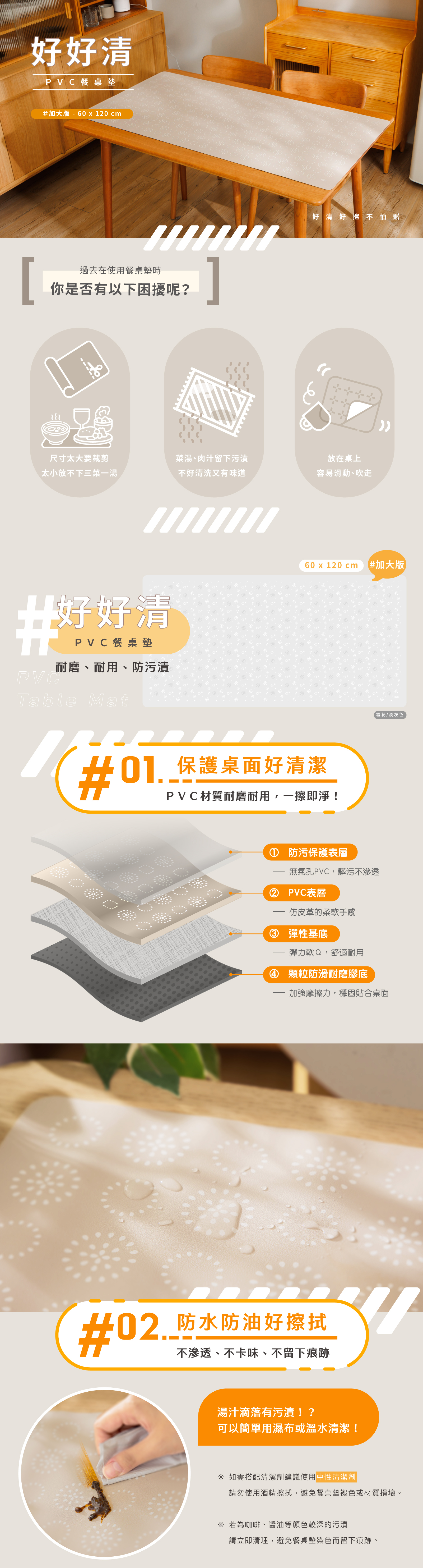 ・請勿將本產品使用於非本產品所列之用途。 ・本產品初次開封時會有PVC製品特有氣味,建議可用濕布清潔後置於通風處陰乾,待氣味減少後再使用。 ・本產品請勿直接接觸食品,並請勿將高溫鍋具、烤盤等直接置放本產品上,以避免造成危險或本產品損壞。 ・本產品表面若使用後有污漬可以濕布或溫水清潔,如需搭配清潔劑建議使用中性清潔劑, 請勿使用酒精擦拭,以避免本產品發生褪色或材質損壞之可能。 ・若為咖啡、醬油等顏色較深的污漬,請依照前述清潔方式立即清理,以避免造成本產品染色留下痕跡。 ・請注意,若長時間鋪設於桌面的情況下,將可能導致桌面會有染色的情況發生。 ・請勿使用刀具或銳利工具在本產品上進行切割或刮削,以避免造成本產品損壞或影響原使用用途。 ・請勿將本產品放置於高溫處、火源旁或高溫曝曬的空間,以避免造成本產品損壞之風險。 ・本產品為重覆性使用產品,但如您發現本產品已有材質刮傷、龜裂等現象, 表示其品質已劣化或老化且易藏污納垢,建議立即停止使用並更換新品。 |