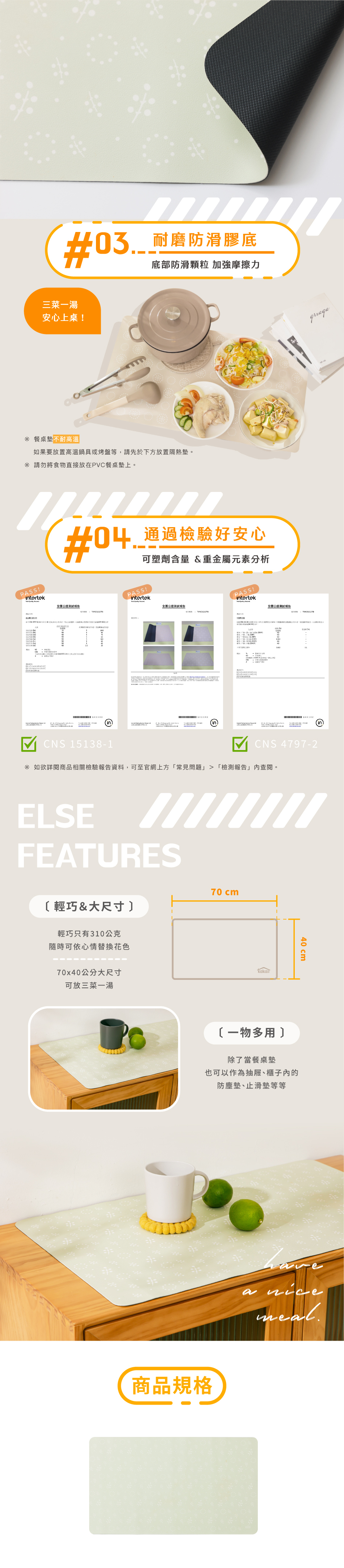 | 品 名 | 好好清 PVC餐桌墊 | 用 途 | 防止桌面髒汙、刮傷 | 數 量 | 1 入 | 材 質 | 聚氯乙烯(PVC) | 尺 寸 | 40 × 70 × 0.18 cm±5% | 總 重 量 | 310 g±10% | 產 地 | 台灣設計・監製|中國製造 |