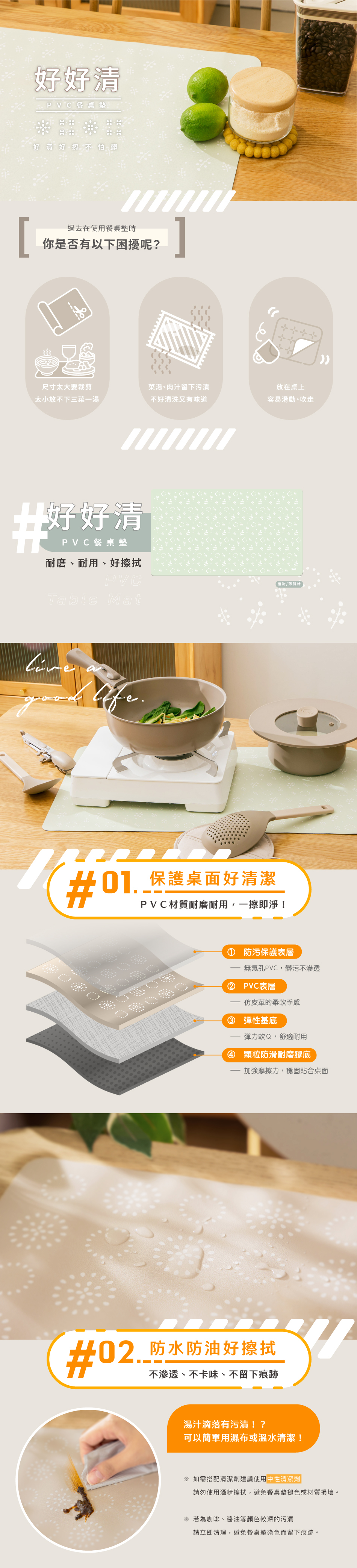 ・請勿將本產品使用於非本產品所列之用途。 ・本產品初次開封時會有PVC製品特有氣味,建議可用濕布清潔後置於通風處陰乾,待氣味減少後再使用。 ・本產品請勿直接接觸食品,並請勿將高溫鍋具、烤盤等直接置放本產品上,以避免造成危險或本產品損壞。 ・本產品表面若使用後有污漬可以濕布或溫水清潔,如需搭配清潔劑建議使用中性清潔劑, 請勿使用酒精擦拭,以避免本產品發生褪色或材質損壞之可能。 ・若為咖啡、醬油等顏色較深的污漬,請依照前述清潔方式立即清理,以避免造成本產品染色留下痕跡。 ・請注意,若長時間鋪設於桌面的情況下,將可能導致桌面會有染色的情況發生。 ・請勿使用刀具或銳利工具在本產品上進行切割或刮削,以避免造成本產品損壞或影響原使用用途。 ・請勿將本產品放置於高溫處、火源旁或高溫曝曬的空間,以避免造成本產品損壞之風險。 ・本產品為重覆性使用產品,但如您發現本產品已有材質刮傷、龜裂等現象, 表示其品質已劣化或老化且易藏污納垢,建議立即停止使用並更換新品。 |