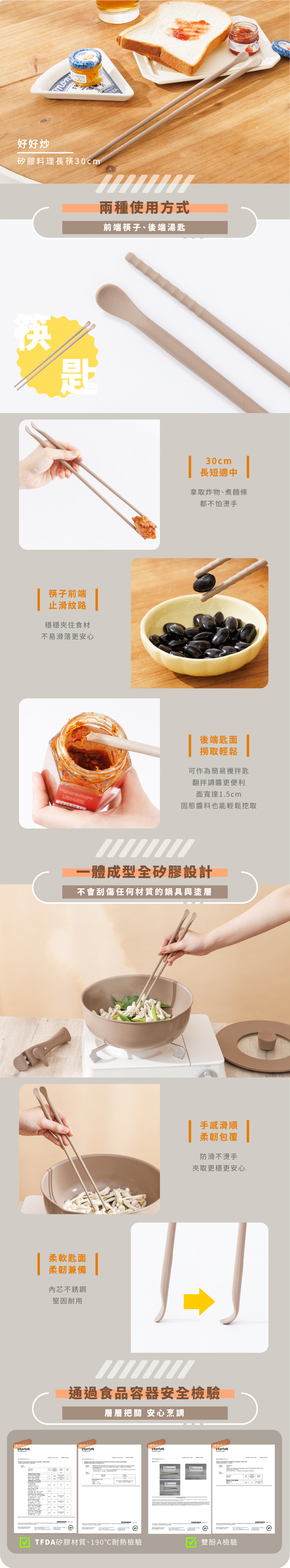 | 品 名 | 好好矽膠矽膠料理長筷30cm | 材 質 | 矽膠、內膽不銹鋼 | 尺 寸/重 量 | 單隻 30 × 1.4 × 0.6 cm ±5%/一雙 43g ±10% | 耐熱溫度 | 矽膠 190℃ | 產 地 | 台灣設計・監製|中國製造 |