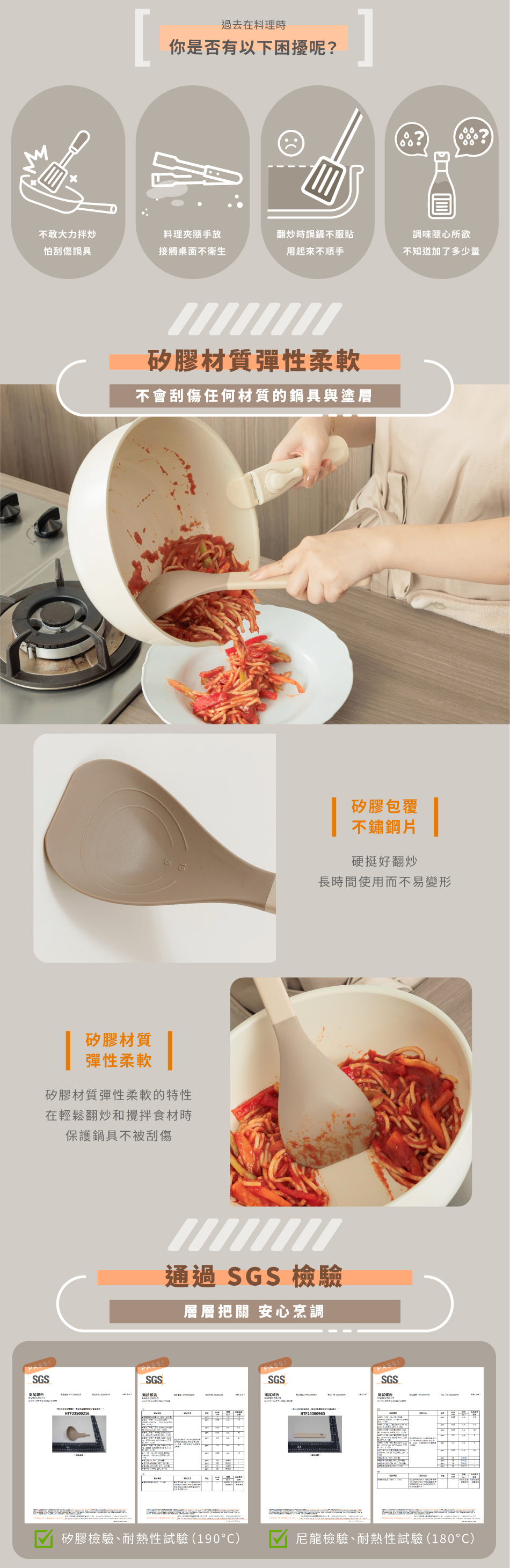 ▸ 前端矽膠包覆不鏽鋼片,硬挺更好翻炒、久用不怕變形。
