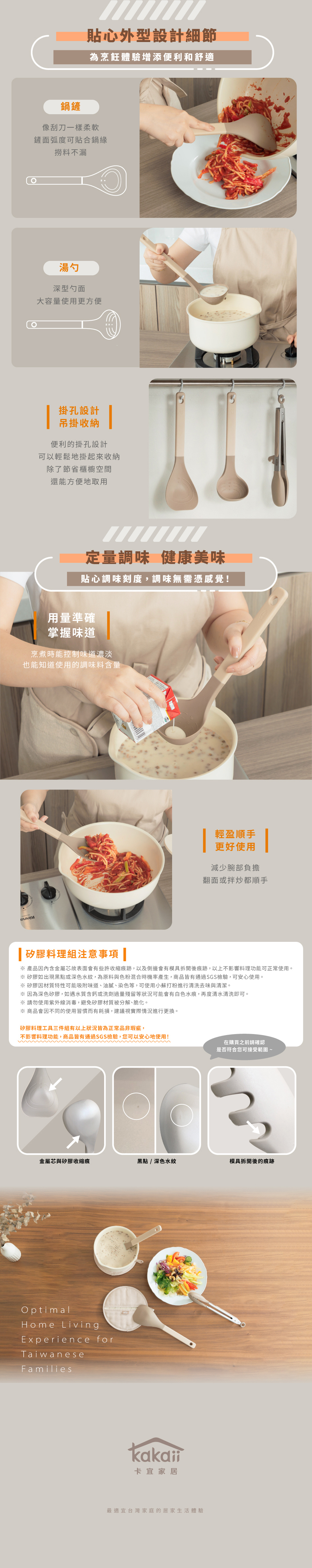 | | 品 名 | 好好炒矽膠三件組 內含鍋鏟、湯勺、細夾 | 材 質 | ・鍋鏟/湯勺:前端-矽膠、不鏽鋼 ; 把手-尼龍 ・細夾:矽膠、不鏽鋼 | 尺 寸/重 量 | ・鍋鏟:29.5 × 9 × 5.3 cm ・湯勺:27.8 x 9 x 6 cm ・細夾:28 x 5.4 x 1.9 cm | 產 地 | 台灣設計・監製|中國製造 |