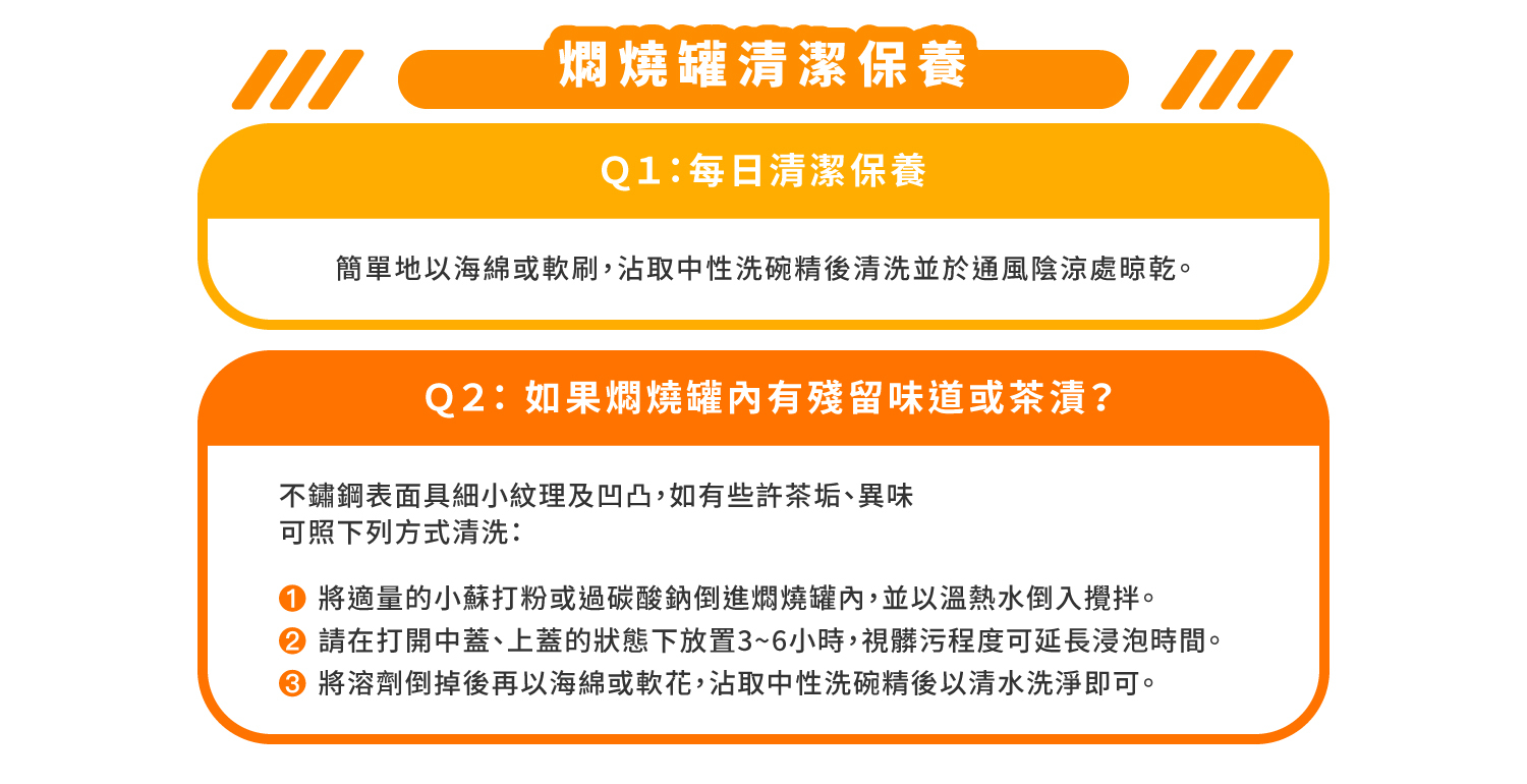 | 清洗方式 | ・首次盛裝食物前,建議先以中性清潔劑清洗本產品,以乾布將本產品擦乾,確保表面乾淨無污漬。若清洗後還有發現些許污漬,可以重複上述動作或將沾有醋水的海綿刷洗內部,再用大量溫水沖洗乾淨。 ・本產品每次使用完畢後之污漬,請盡速清潔乾淨,以免污垢累積。 ・本產品可重複使用,每次使用完畢後,以軟海綿搭配中性清潔劑清除 油污(請勿使用科技海綿或強酸、強鹼清潔劑),清洗時請勿使用金屬 鋼刷等尖銳物品,避免本產品產生刮痕或損壞。 ・清洗後,請用乾布擦乾本產品,並放置於乾燥的環境。 ・請勿將本產品使用於洗碗機或烘碗機,以免影響保溫效果。 | 注意事項 | ・本產品為食品接觸用途,請勿將本產品使用於非本產品所列之用途。 ・將本產品放入包袋內之前,請確保內蓋及上蓋旋緊,並保持本產品直 立狀,避免大力搖晃、側倒或倒置本產品,以免滲漏,造成危險或毀 損其他物品。 ・請勿盛裝過熱的食物,過高的溫度會導致內壓過大,打開時可能噴出 燙傷。開蓋時請慎防熱氣。 ・請勿盛裝太滿,以免鎖蓋時溢出,造成危險。 ・請避免盛裝碳酸飲料、牛奶或果汁等容易腐蝕或滋生細菌的食物。 ・請放置於嬰幼兒不易拿取處,以免造成砸傷或燙傷。 ・請勿使本產品掉落地面、受劇烈碰撞或有投擲、扔摔本產品等行為,以免導致本產品破裂損壞、縮短使用壽命或造成危險。 ・本產品於正常使用一段時間後,若出現表面輕微刮痕或磨損,屬自然 耗損,若發現本產品有嚴重刮傷、龜裂、破損、缺口或變形等情況時, 請立即停止使用。 ・不鏽鋼材質雖具防鏽性,但若長時間接觸酸、鹼性食物或潮濕環境, 仍可能鏽蝕。 ・本產品為金屬製品,請勿放入有微波或光波的爐具,如微波爐、水波爐等。 ・尺寸為手工測量會有些許誤差,請依實際商品為準。 ・因各廠牌螢幕解析度、畫質設定不同,商品顏色以實際收到為主。 |