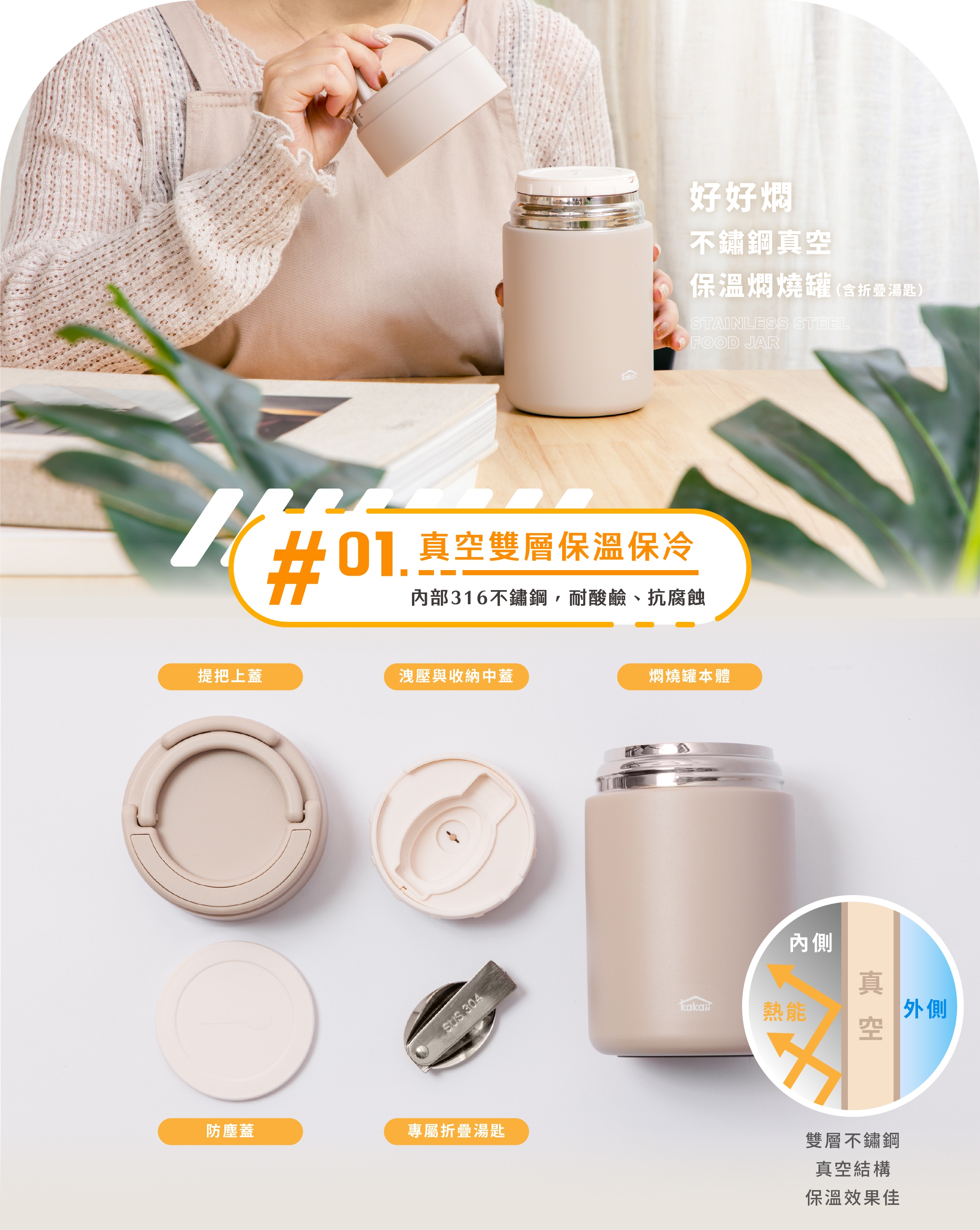 | 品 名 | 好好燜不鏽鋼真空保溫燜燒罐(含折疊湯匙) | 材 質 | ・罐身-不鏽鋼(內層316不鏽鋼、外層201不鏽鋼) ・上蓋-PP塑膠(耐熱溫度100℃)、矽膠(耐熱溫度180℃) ・折疊湯匙 - 304不鏽鋼 | 尺 寸/重 量/容 量 | 9 × 9 × 16.5 cm ±10% / 385 g ±10%,約 600 ml | 產 地 | 台灣設計・監製|中國製造 |