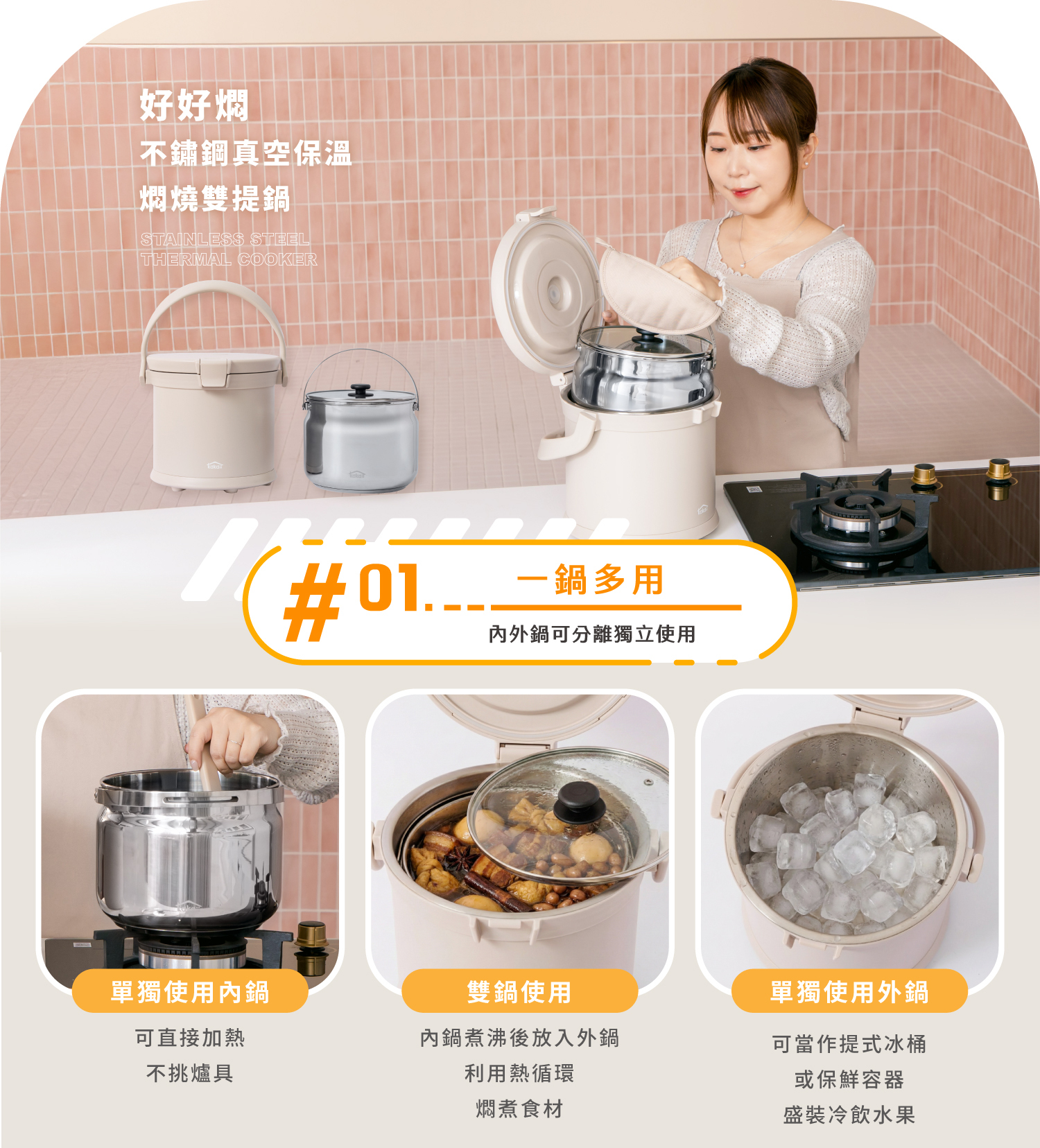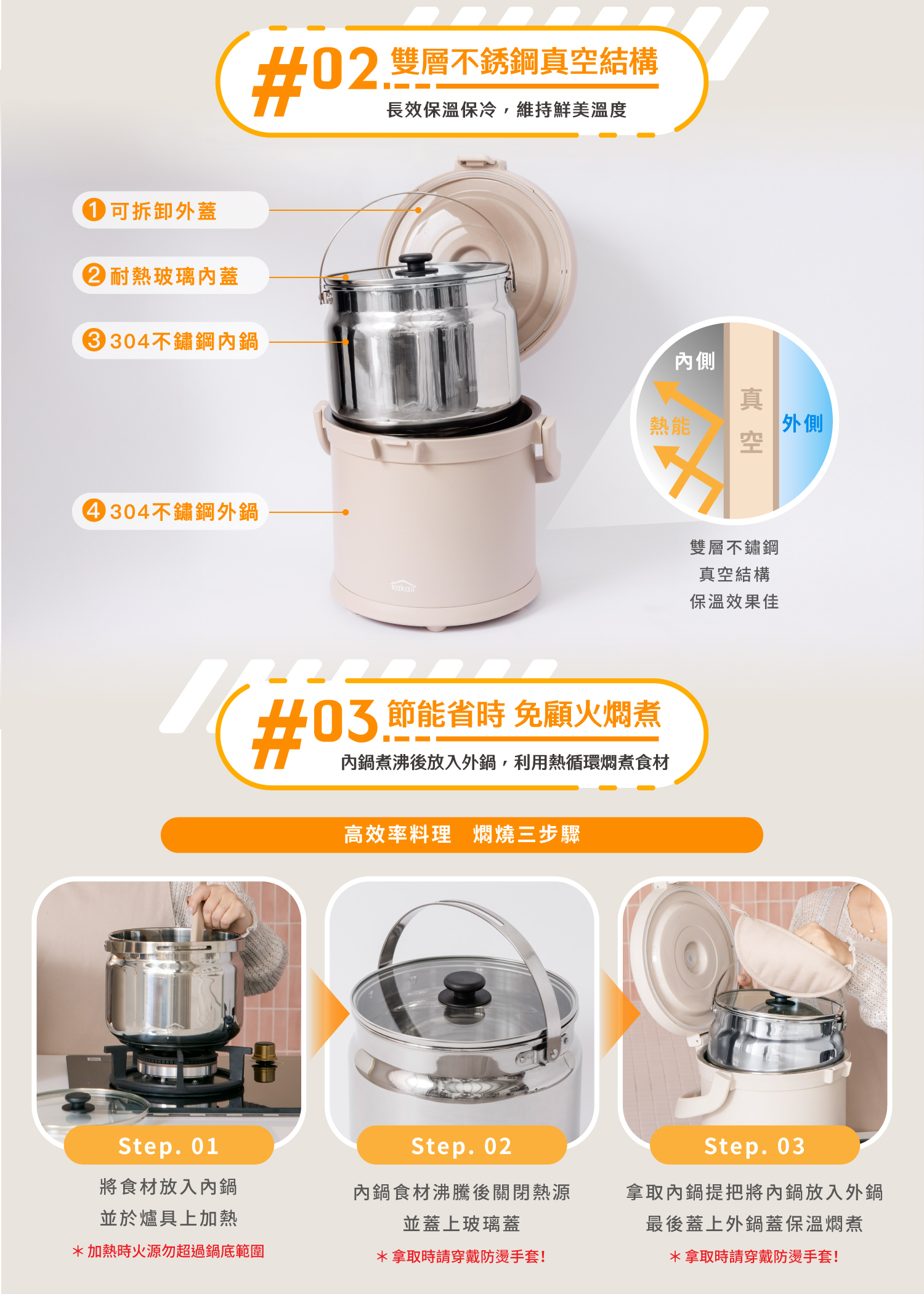 ・本產品僅有內鍋可於爐上加熱,請勿直接於爐上加熱外鍋。加熱後的內鍋把手會變燙,移動請搭配隔熱手套使用,開蓋時請慎防熱氣。